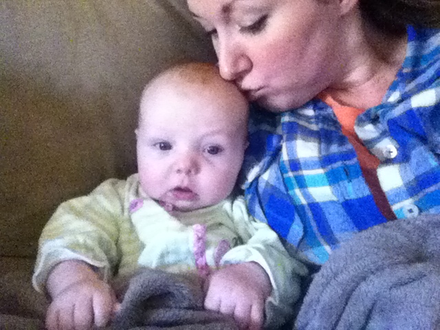 As far as sleep goes, you are still doing great. You are usually asleep by 7:30-7:45, get up for a dreamfeed between 10:00-10:30, and then you wake sometime between 1:00am-5:30am to eat again. You are absolutely unpredictable about when you'll get up during the night. You still take about a two hour morning nap, a brief nap around lunchtime, and then another nap that lasts around an hour and a half in the afternoon. About once a week or so you'll rest in the evening, but not generally. The biggest sleep-related development this month is that you no longer sleep in your Napnanny. The day before you turned 4 months, I removed it from your bed and you've done great with the transition. You're back in it for a few days, because you have your first cold and you sleep more comfortably when you're elevated.
